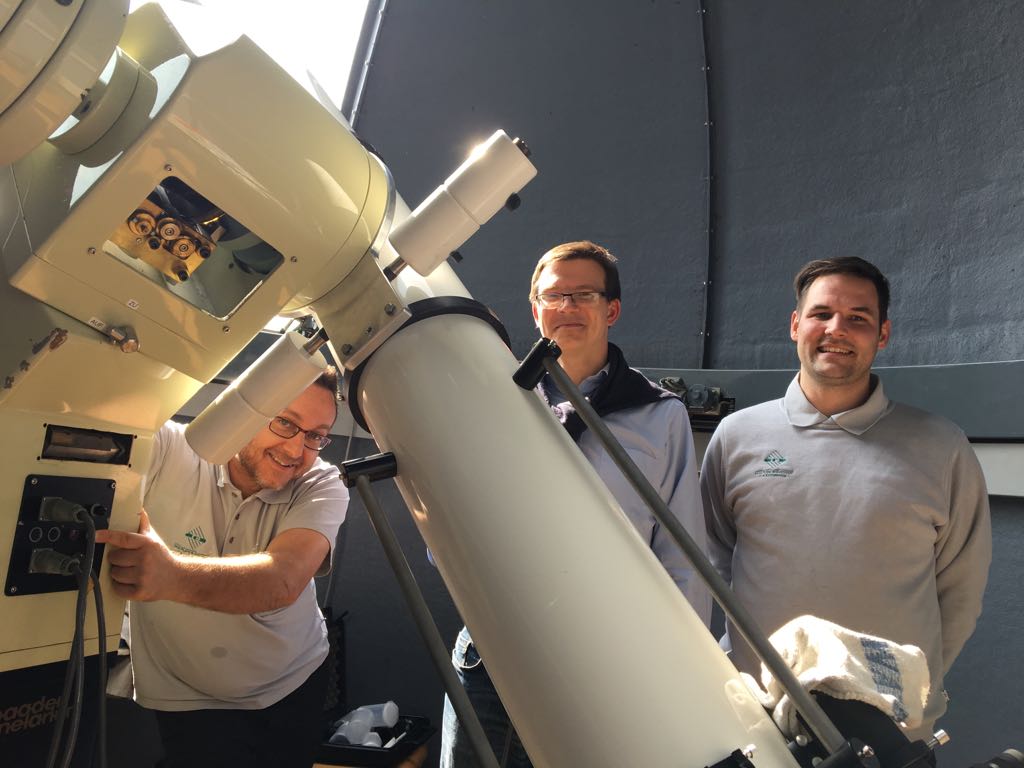 Dieses Photo entstand beim letzten Treffen des Teams: Matthias Jünger und Jochen Stephan (Stadt Heidelberg) haben das Photo aufgenommen und sind daher nicht im Bild und über die funktionierende Nachführung freuen sich (v.l.n.r.):