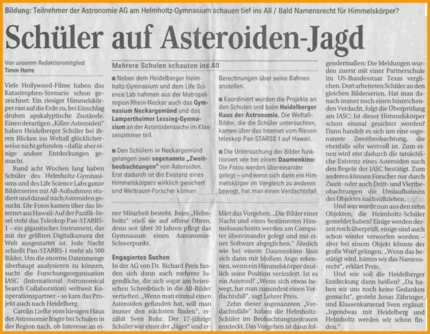 Die Mittelstufen-AG Astronomie ist offen für Schülerinnen und Schüler aller Heidelberger Gymnasien ab Klassenstufe 8. Das Erstellen von astronomischen Modellen und das gemeinsame Beobachten des Nachthimmels stehen hier im Vordergrund. Ein Highligth des aktuellen Schuljahres war die erfolgreiche Teilnahme am Pan-Starrs-Projekt. Hier ein kleiner Bericht davon (Quelle: Mannheimer Morgen, 19.01.11):